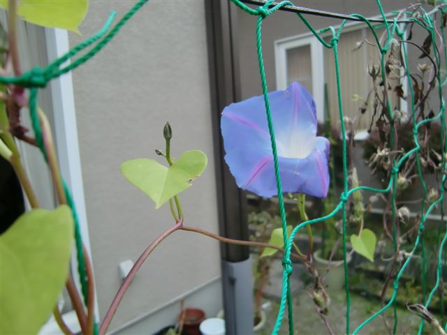 我が家では アサガオが頑張って咲いている。 もう網をかたずけたいが ちょっとかわいそうで、、、。